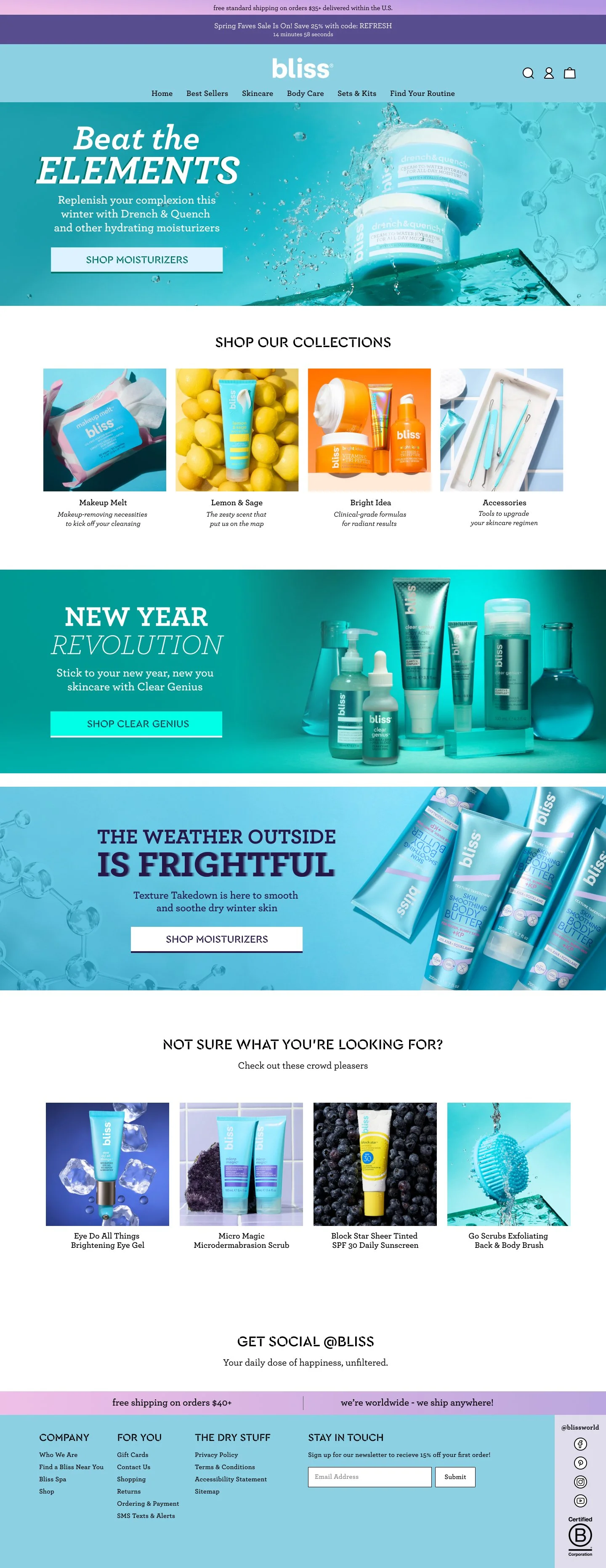 The new homepage design for Bliss Skincare is a visually appealing and informative platform that highlights the brand’s top-selling franchises. Inspired by the challenges of dry winter skin, the design incorporates water droplets, a cool color palette, and molecular elements to convey intense hydration and science-backed formulations. Optimized for both desktop and mobile devices, this homepage offers a refreshing and engaging user experience.